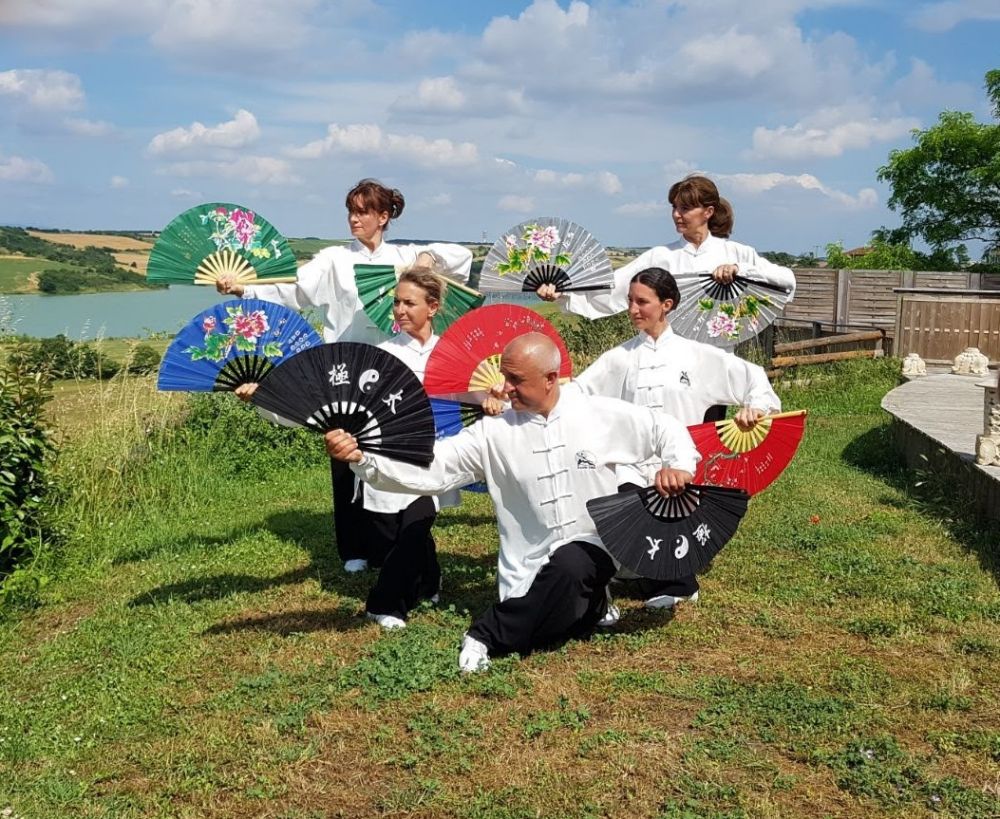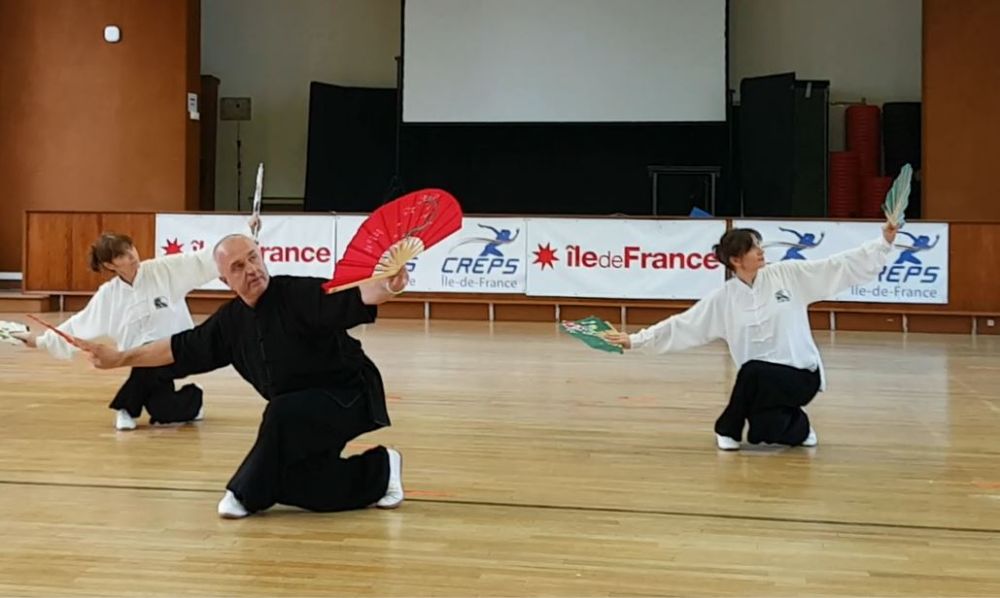 La pratique du double éventail requiert fluidité et précision, elle permet de développer la coordination, la souplesse, la force des appuis et le travail de la taille. La forme étudié à l'AMUSJ est adaptée d’une forme traditionnelle chinoise avec orientation martiale. Cette forme et celle enseignée à l’école TAO par Thierry Alibert.